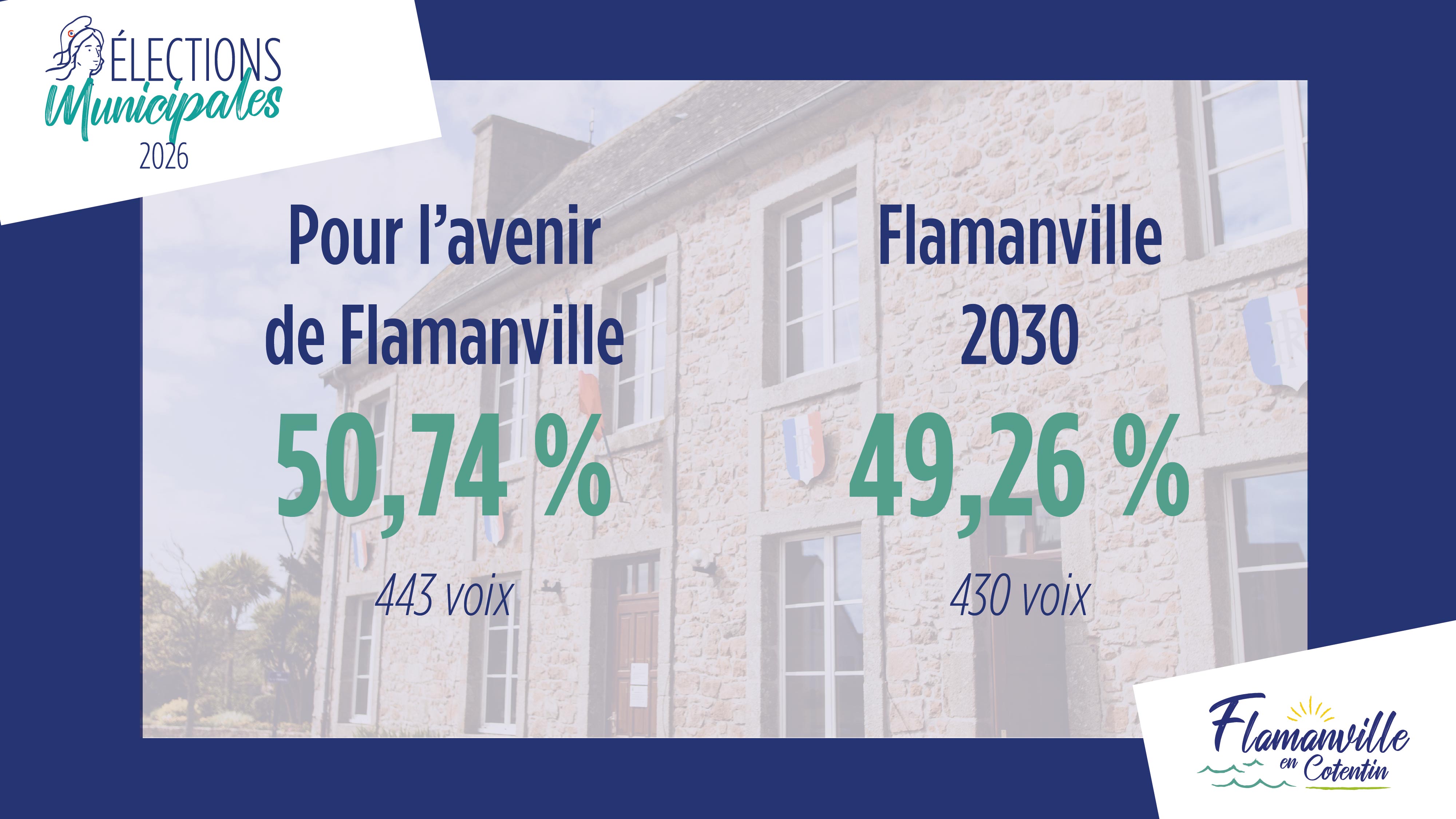 16 mars 2026 - In Actualités By Communication Comment off ÉLECTIONS MUNICIPALES 2026 | Résultats Pour L’avenir De Flamanville : 50,74 % (443 voix) ✅Flamanville 2030 : 49,26 % (430 voix)Récapitulatif :Inscrits : 1 342Votants : 890Exprimés : 873Abstentions : 452Blancs : 8Nuls : 9Merci à tous les habitants qui ont participé à ce moment démocratique important pour notre commune Précédent INFOS PRATIQUES | Travaux bruyants : quels horaires ?